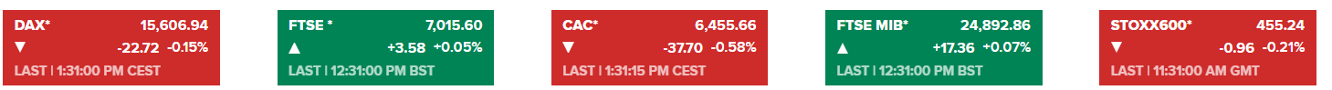 欧美股市:欧洲股市的风险情绪有所升温,因上个月欧洲汽车销量上涨了10%。富时100指数开盘后上涨0.5%,法国CAC指数上涨0.4%,德国DAX指数上涨0.3%。截至发稿,欧洲主要股指走势如图所示: