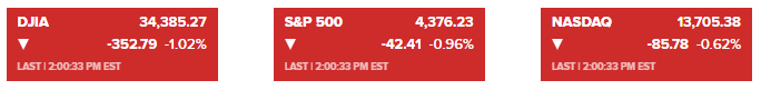 纳指现下跌近0.7%,此前一度涨近1%,标普500指数下跌近1%,道指跌超350点或1%。