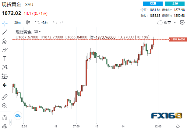 美市盘中,现货黄金继续走高,日内站上1870美元/盎司,为去年11月18日以来首次。