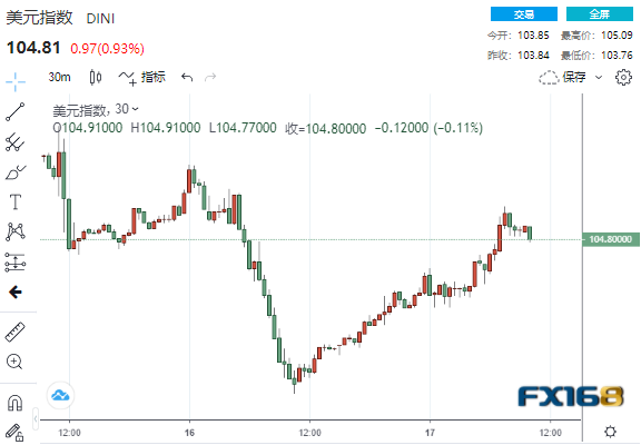 受卡什卡利鹰派言论提振,美元指数周五大幅上涨逾1%至105.09高点,较日低拉升逾130点。