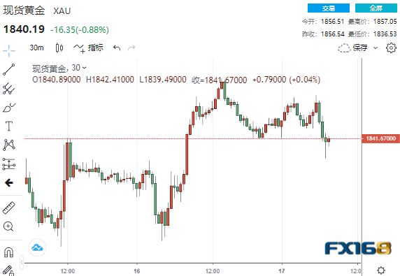 美市盘中,现货黄金下跌超1%,至1836.53美元/盎司低点,较日高回落超20美元。