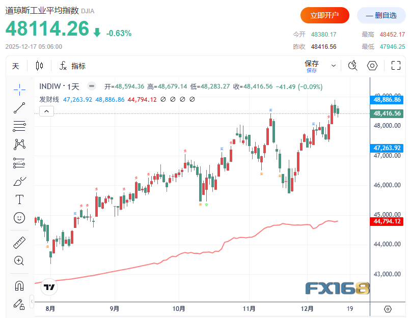 FX168财经报社(北美)讯 在11月非农就业报告延迟公布、原油价格大幅下跌以及市场对美联储政策路径持续评估的背景下,美股周二(12月16日)走势分化,标普500指数与道指连续第三个交易日收低,纳指则小幅反弹,显示资金在高估值科技股与防御板块之间轮动。