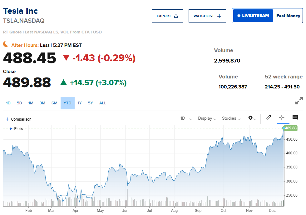 在今年第一季度股价暴跌36%、创下自2022年以来最差季度表现后,特斯拉股价已强势反弹,不仅完全收复失地,还在周二上涨3.1%,收于489.88美元,创下历史收盘新高,年内累计涨幅已达21%。