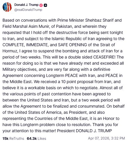 特朗普在Truth Social上发文称:“我同意暂停对伊朗的轰炸和攻击两周。我们收到了伊朗提出的一份10点方案,并认为这可以作为谈判的可行基础。”