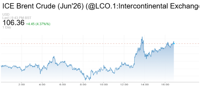 在这一背景下,油价盘中明显走高。布伦特原油期货最终收于105美元/桶上方。